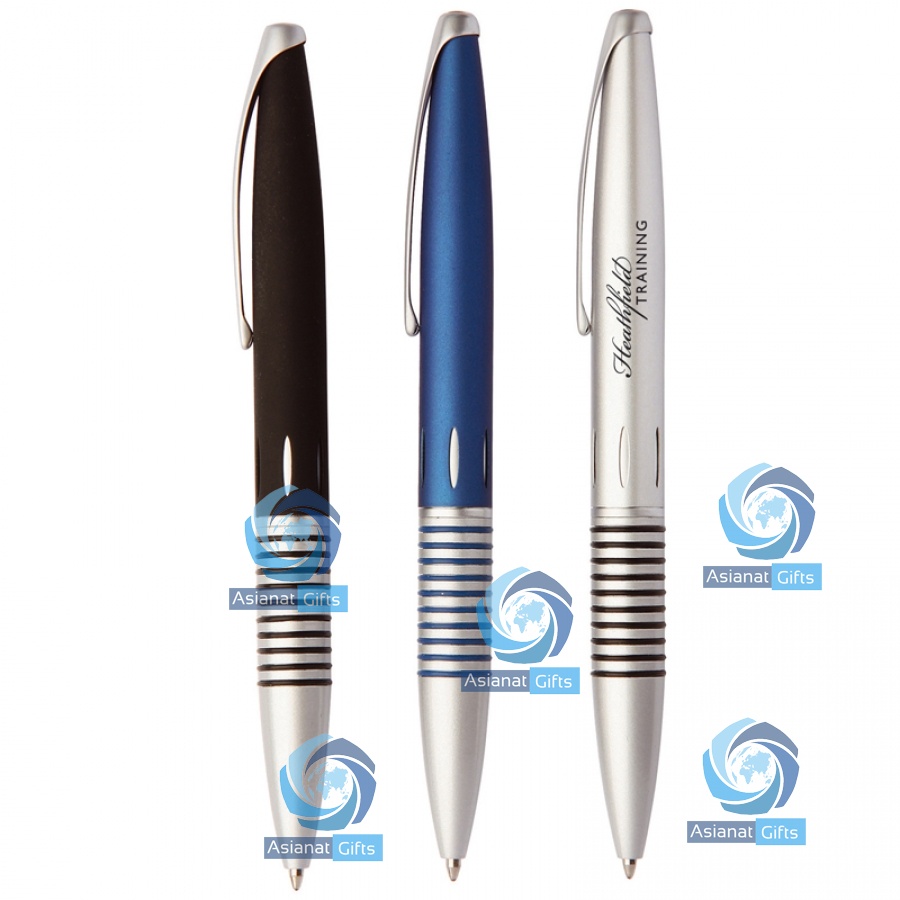 Stylish twist action ballpen with sleek rubber grip rings. Optional gift box. Black and silver pens have black ink, blue pen has blue ink.