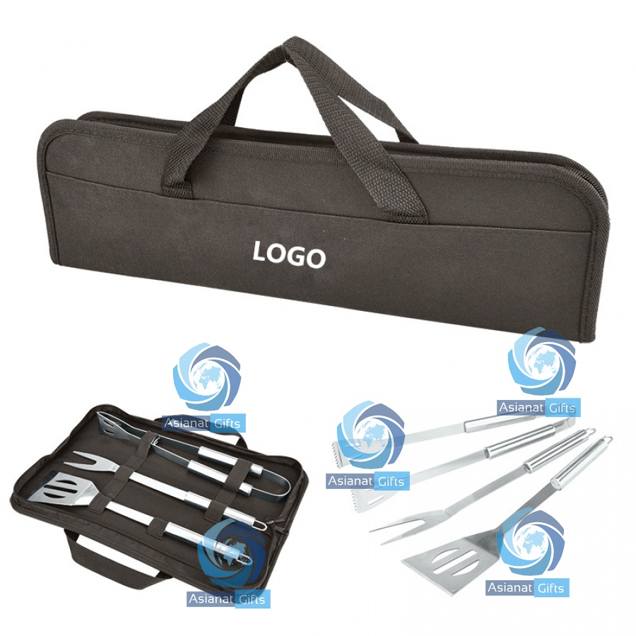 3 pc BBQ set including utensils spatula, fork and tongs packed in durable 600D Polyester case. Case features zipper closure, front open pocket, and polyester web handles. Includes dishwasher safe stainless steel fork, tongs and spatula. Fork and tongs each measure approx. 13 3/4", and stainless steel spatula measures. 15 3/4" W x 4 3/4" H x 2" D. 15 3/4" W x 4 3/4" H x 2" D