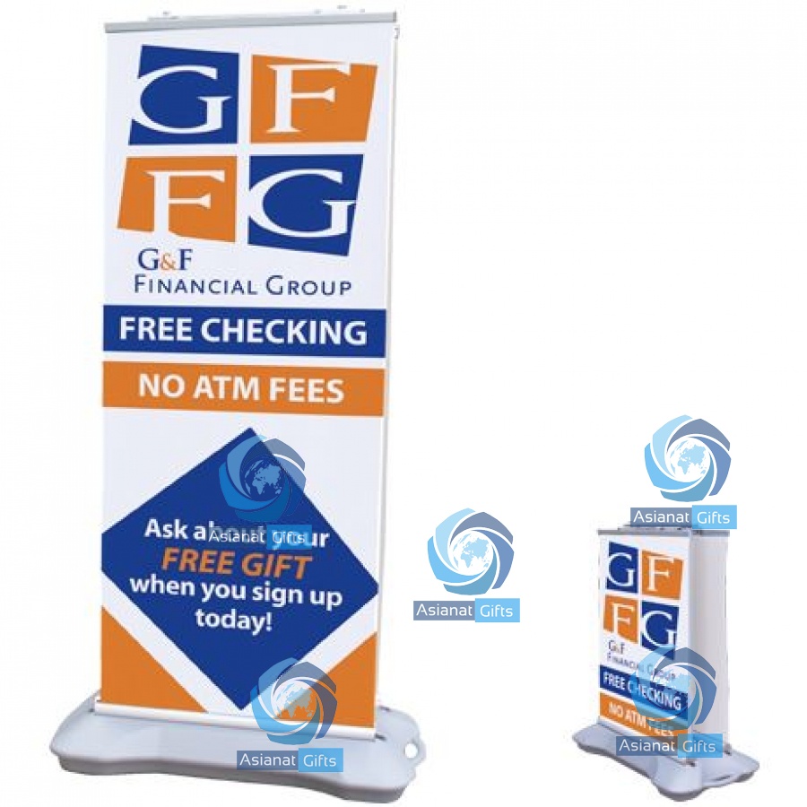 Banner displays adjust up to 87" in height. Easily change your message with removable graphic roller. Base fills with water to secure your banners and includes a built-in handle and wheels for easy relocation. High-quality 13 oz. vinyl banner is printed with weather resistant UV inks. Banners retract into interchangeable cartridges. Kit includes hardware, two banner graphic cartridges and soft carry case.