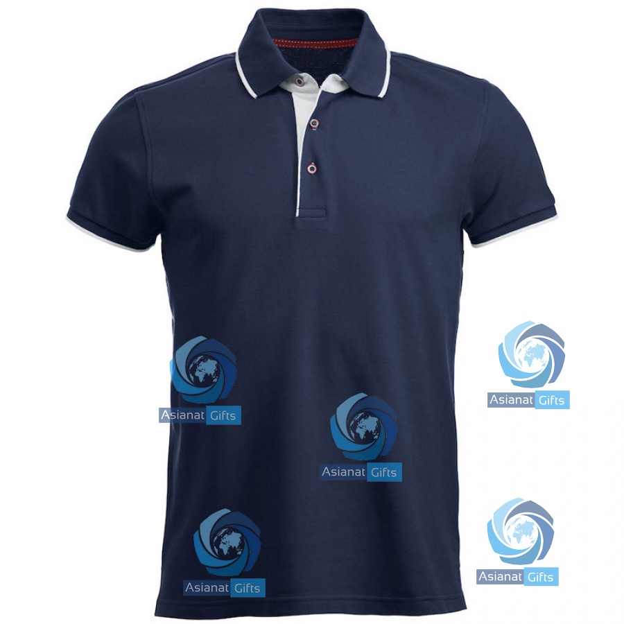 Polo with colour contrast for buttons, necktape, placket and side vent. Standing shirt collar and placket with 3 buttons. Contrast stripe at collar and sleeve end
