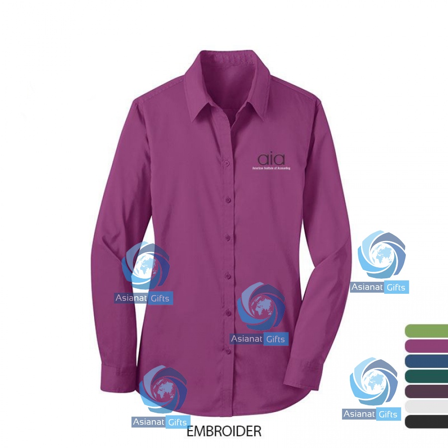 With a touch of spandex for enhanced movement, this poplin style stretches and moves with you as you go about your workday. Vibrant color makes it a go-to choice for today's uniforming needs. Features gently contoured silhouette, open collar, 7-button placket to reduce gaping, bust darts, back princess seams, impact-resistant buttons, adjustable button-through sleeve plackets, shaping at waist, and shirttail hem.