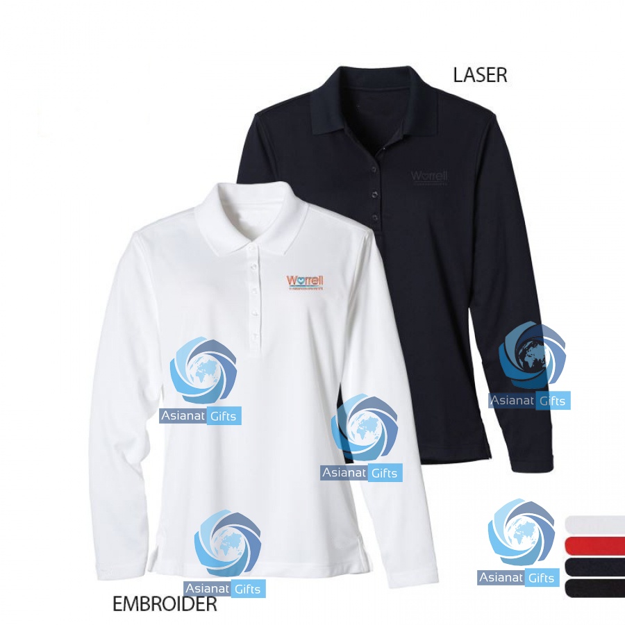 100 wicking fabric offers breathable moisture management. Classically styled long-sleeve polo with flat knit collar features 5 button placket and contrast inner V-notch side slits with "X" shaped bartacks for durability. Shaped seams for flattering fit.