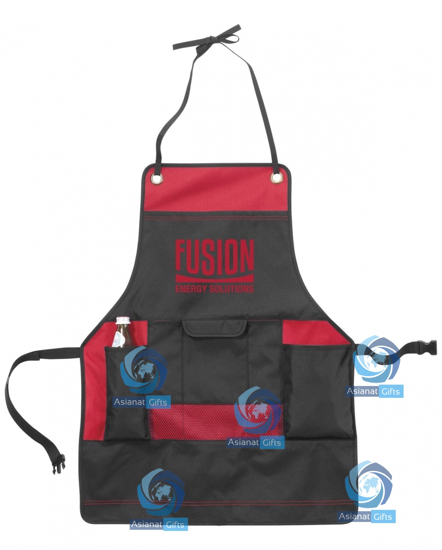 The Just Grillin' Apron features multiple pockets for the storage of tools, including a top slash pocket, 2 side beverage pockets, and an additional small pocket with a Velcro closure. A neck strap with tie strings and an adjustable waist strap with a buckle help this apron fit properly. PVC Free and made of 600 denier polyester.