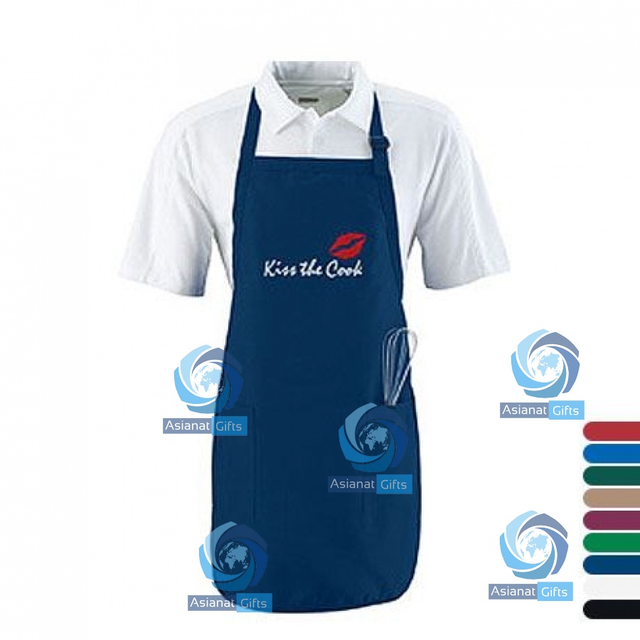 Perfect for restaurants, retail, or at home use. Full length apron features two waist-level front pockets and 1" wide adjustable neck strap. Rounded bottom and self-fabric binding. Apron is 22” x 30”.