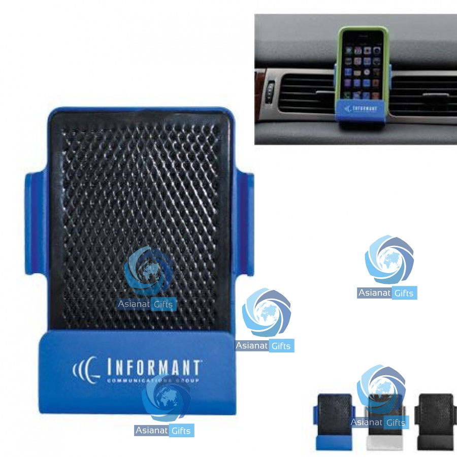 Media lounger for the car holds your cell phone, MP3 player or other mobile device in an upright position for easy viewing and access. Attaches to your vehicle air vents to stay in place. Swivel head fits on vertical or horizontal style vents. Lounger grip pad holds item secure and allows for charging from the side or bottom.