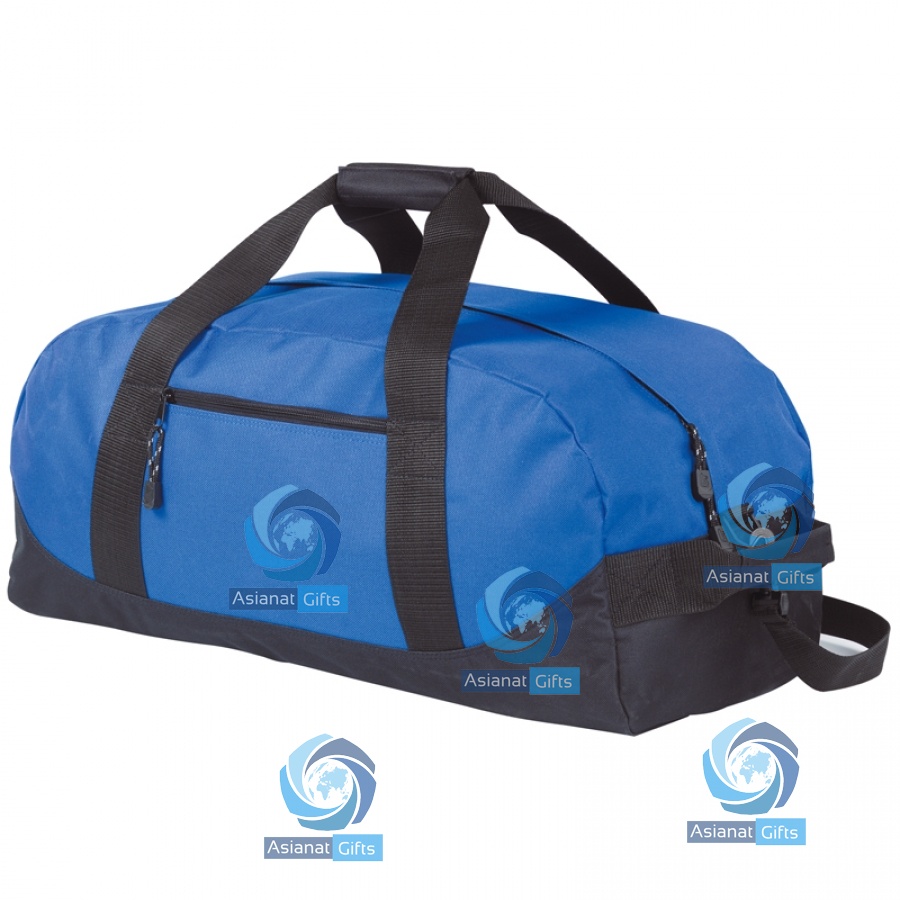 Reach compliant polyester sports holdall with front zipped pocket, carry handle and shoulder strap.