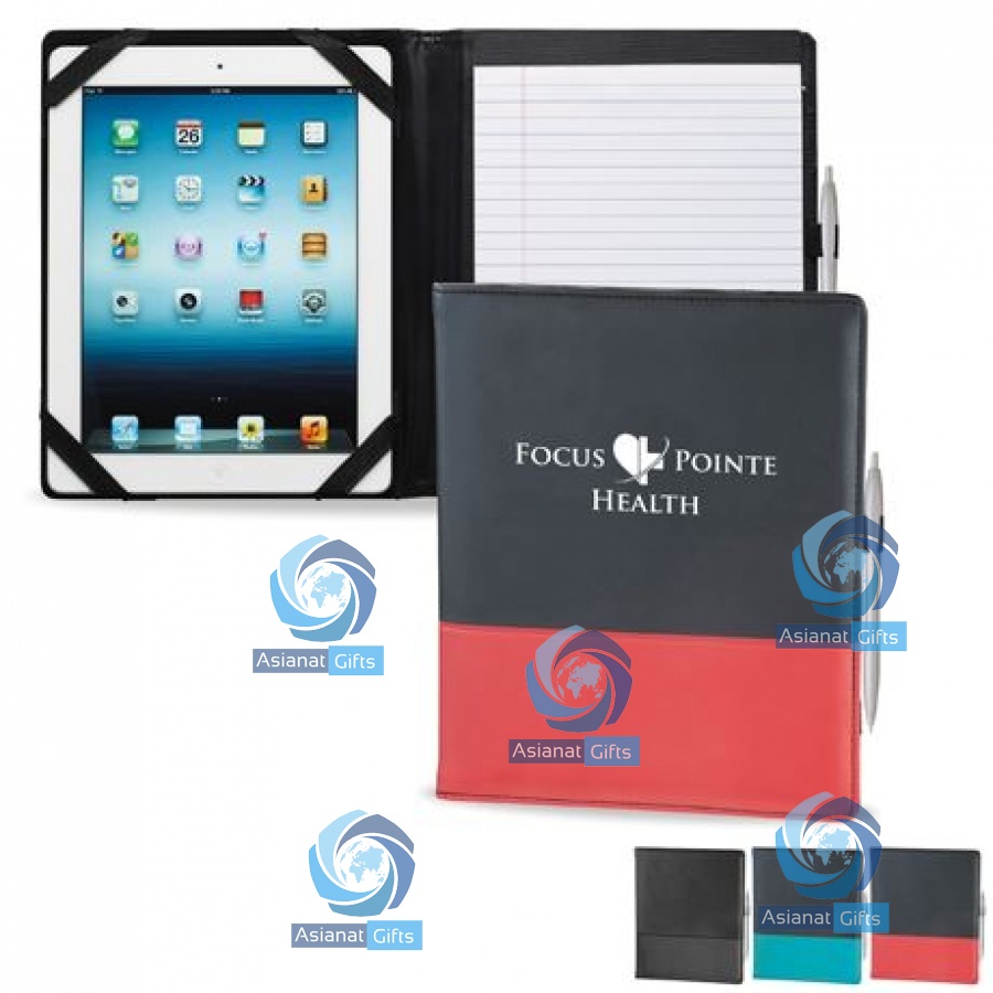 Inside panel holds all iPad® models. Scratch-proof panel protects devices. Includes an elastic pen or stylus loop and a refillable 30 page ruled notepad.
