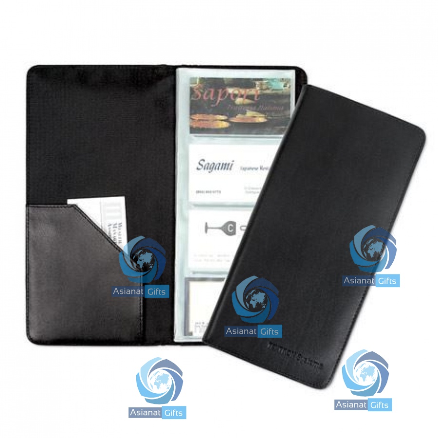 Timeless leather card file has a 96 card capacity and an extra inside pocket adding to its convenience. Polybagged.