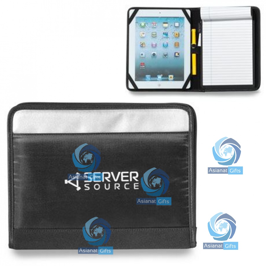 Features removable Velcro corners to accommodate various sized tablets, a scratch-resistant lining for storing papers behind the pad while taking notes, a clean screen feature to gently remove dust and fingerprints, a stylus/pen loop, and concealed business card pockets. Includes a 6" x 9" paper pad (can be refilled with a 5" x 8" paper pad).