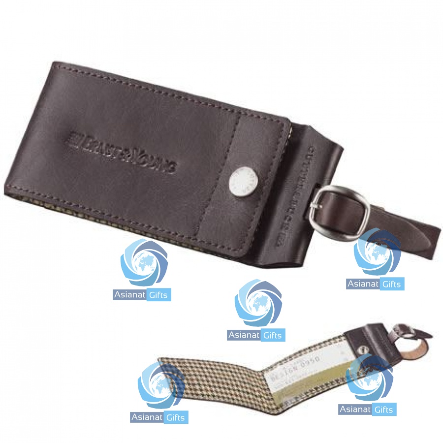 Genuine leather identification tag with button snap closure contains a window for standard or European business cards. Leather watchband-style attachment keeps tag securely on luggage.