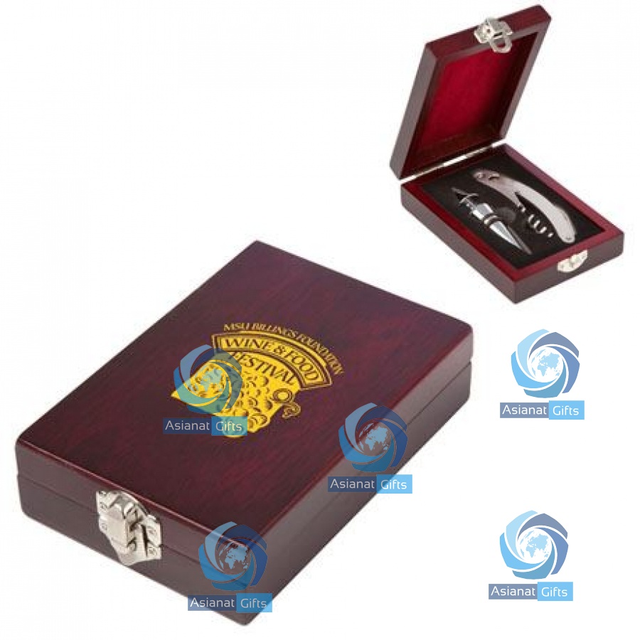 Waiter's corkscrew tool and stylish wine stopper set is displayed in a classic walnut wooden gift box.