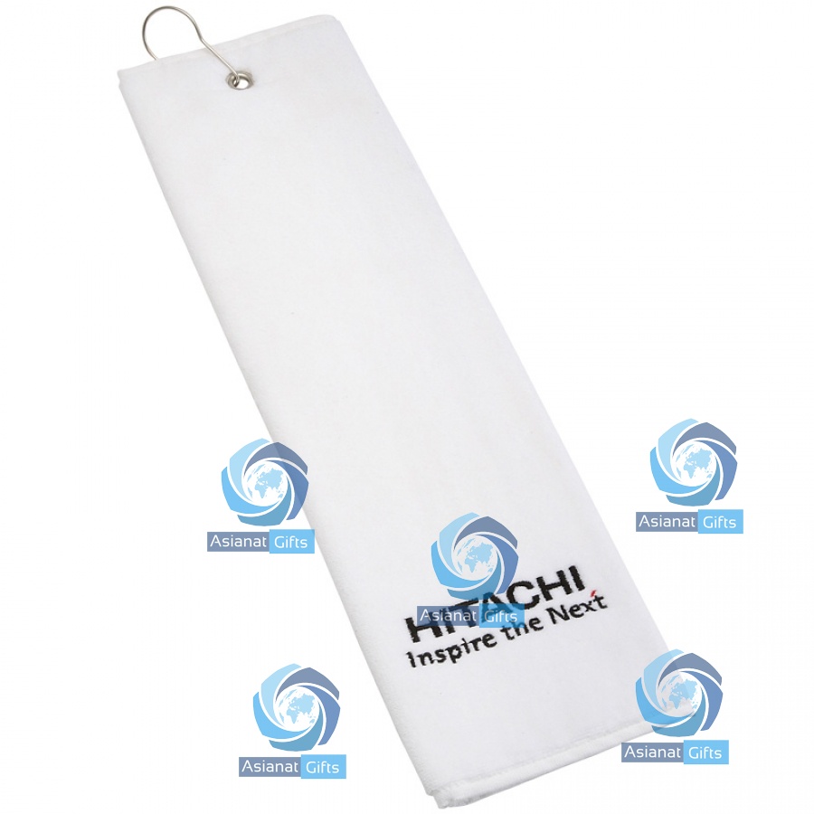 Top quality luxury 650 grams tri-fold velour golf towel embroidered 7,000 stitches to your design. With a silver eyelet and a silver clip for attachment to your golf bag.