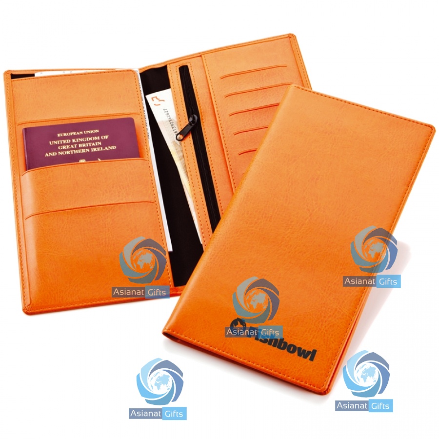 Travel ticket wallet with pockets for your passports, boarding tickets and currency. Slots to hold your credit and health cards.Finished in PU in a choice of twenty colours.