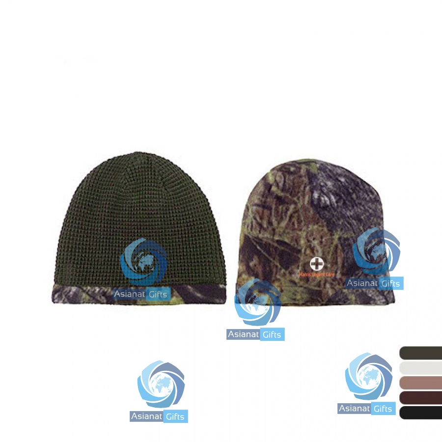 Two hats in one! Side one is rich, waffle knit acrylic and side two soft polyester camo lining. Warmth, style and versatility make this a great gift.