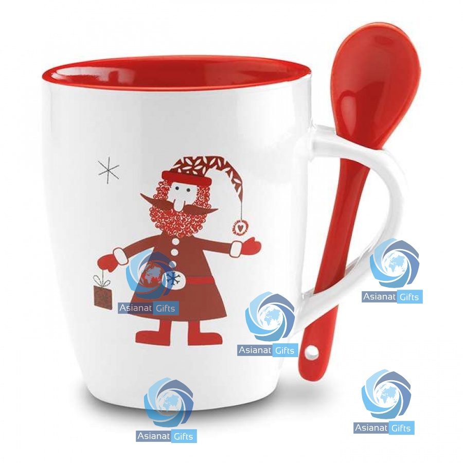 Ceramic mug with Santa Claus design and integrated spoon. Supplied in gift box