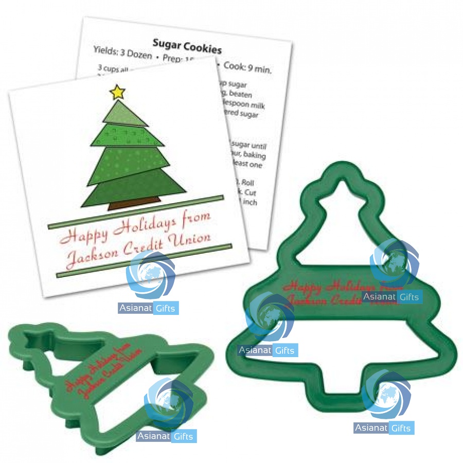 A unique and useful gift for employee appreciation, customer appreciation, the holidays, and more. Tree plastic cookie cutter comes with a card that features your full color imprint on one side and a sugar cookie recipe on the other. Both are polybagged together and ready to hand out