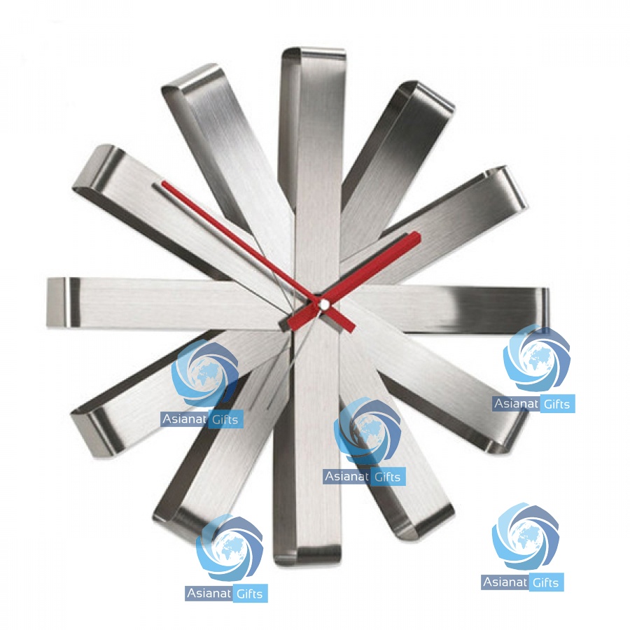Formed brushed stainless steel clock with red and silver hands. Gift Box. 12" W x 12" H x 2" D