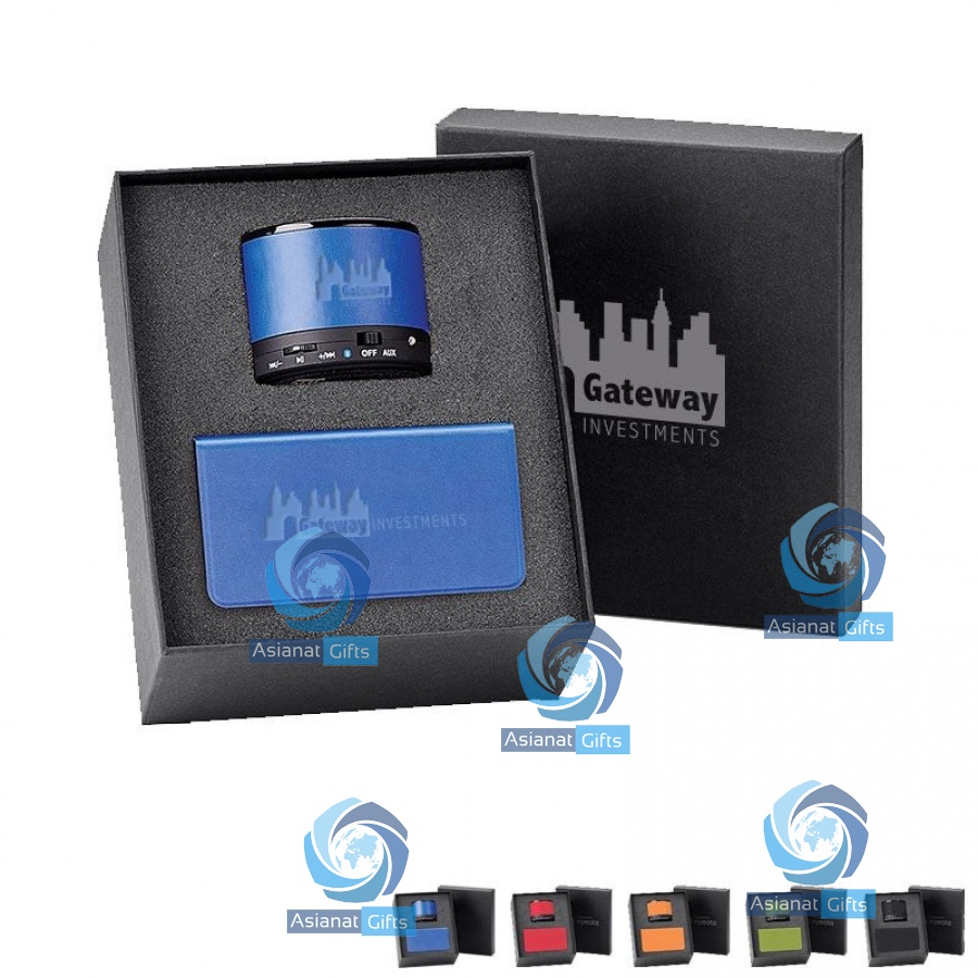 Gift set includes a Bluetooth speaker and power bank. Vinyl wrapped Bluetooth speaker features controls for adjusting volume, play/pause, skipping songs, accepting/rejecting/redialing phone calls, a built-in microphone and LED status indicator. Compatible with audio devices that have a 3.5 mm audio jack and Bluetooth technology.Includes a multi-purpose charging/audio cable with USB, micro-USB and 3.5 mm plugs.