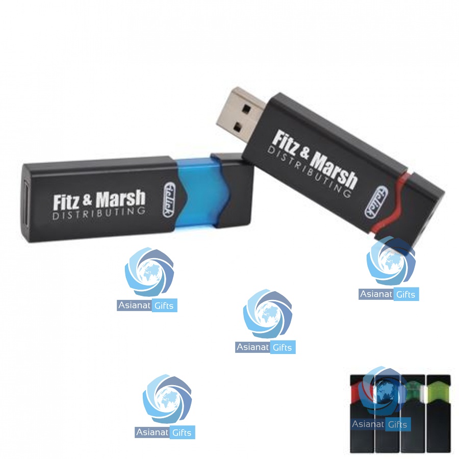Features include click–action retractable port and a colorful accent color. Includes black lanyard. Various memory capacities are available.