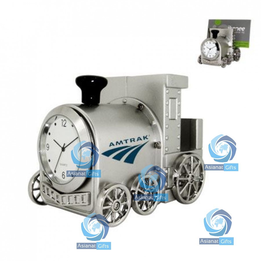Clock in the shape of a train also holds business cards or memo pads. Made of die cast metal housing.Features accurate analog quartz movement.