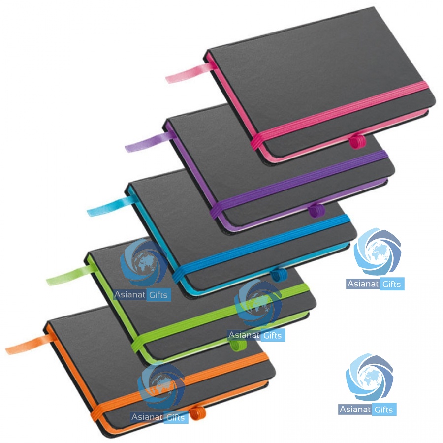 Black PU cover and 160 lined pages.The special appearance is provided by coloured paper edge and matching accessories including integrated book mark and ball pen loop.