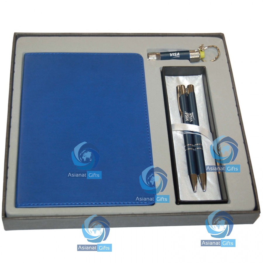 Consists of one soft touch notepad, two matching metal pens and a matching 3-LED torch. Presented in a smart gift box, making this a great corporate gift product.