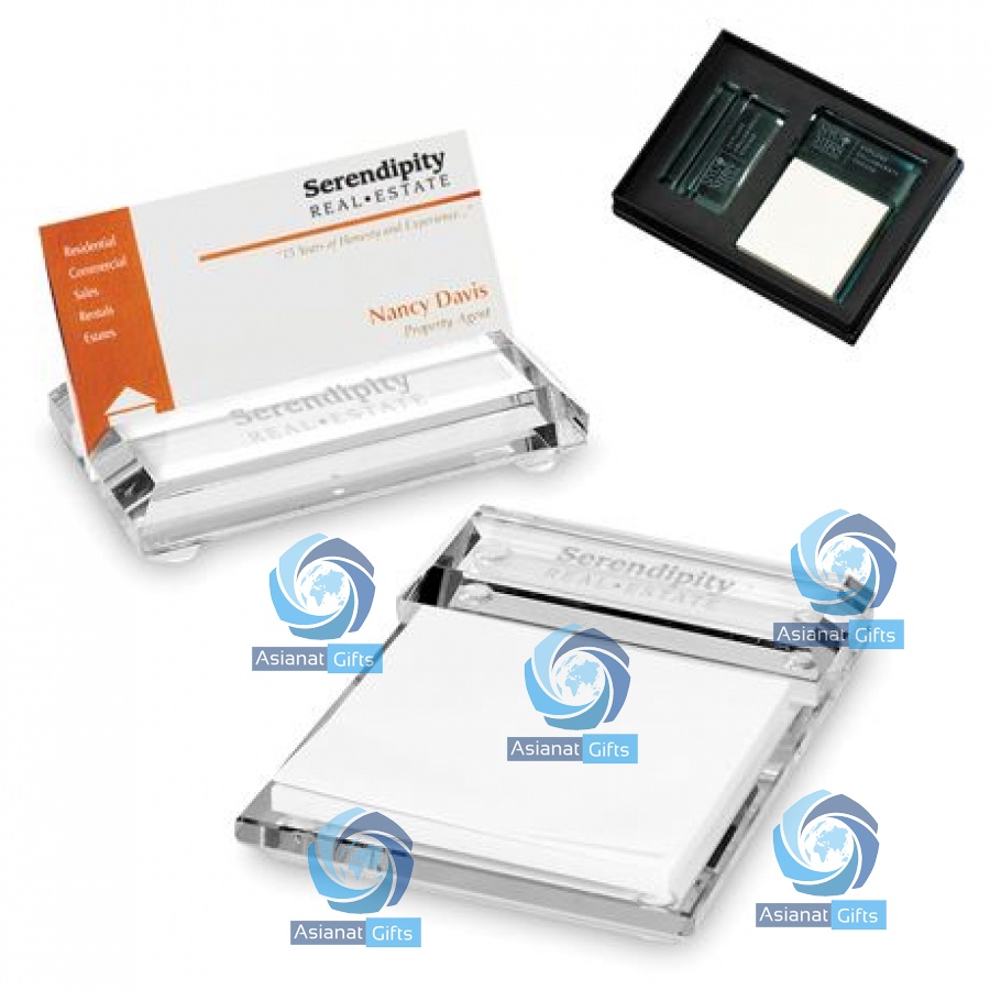 A great gift set for business executives, doctors and more. Set includes a glass business card holder and a glass message pad holder. Both feature cut glass with multi-faceted edges. Pad holder comes with a 3" x 3" memo pad. Screen with frosted white imprint for etched glass look. Packaged in a black gift box.