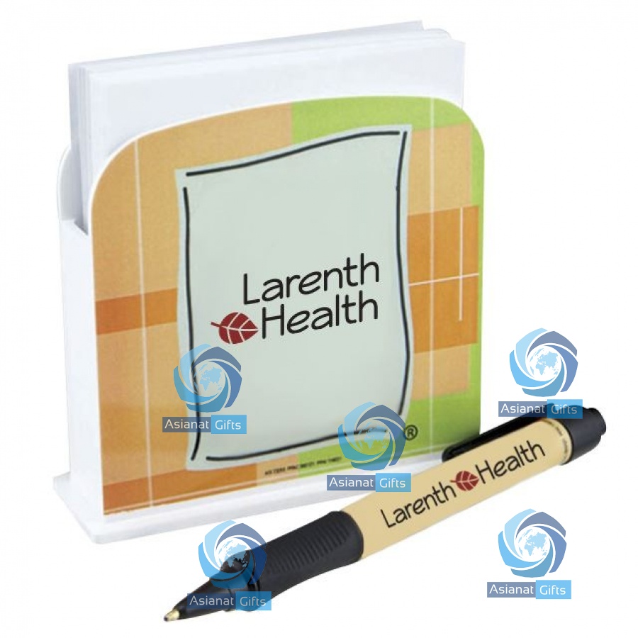 Refillable desk caddy comes filled with 100 sheets of note paper and a retractable grip pen. Pen available in your choice of medium black or blue ballpoint ink. Finished set comes shrink wrapped.