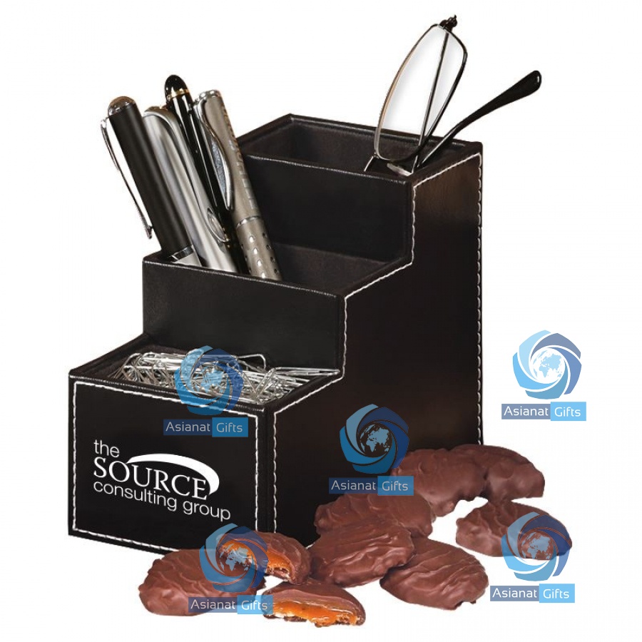 This three-compartment faux leather organizer is a useful and decorative accent piece for any desk or home office. There’s a compartment for pens, another for reading glasses and one for paper clips.