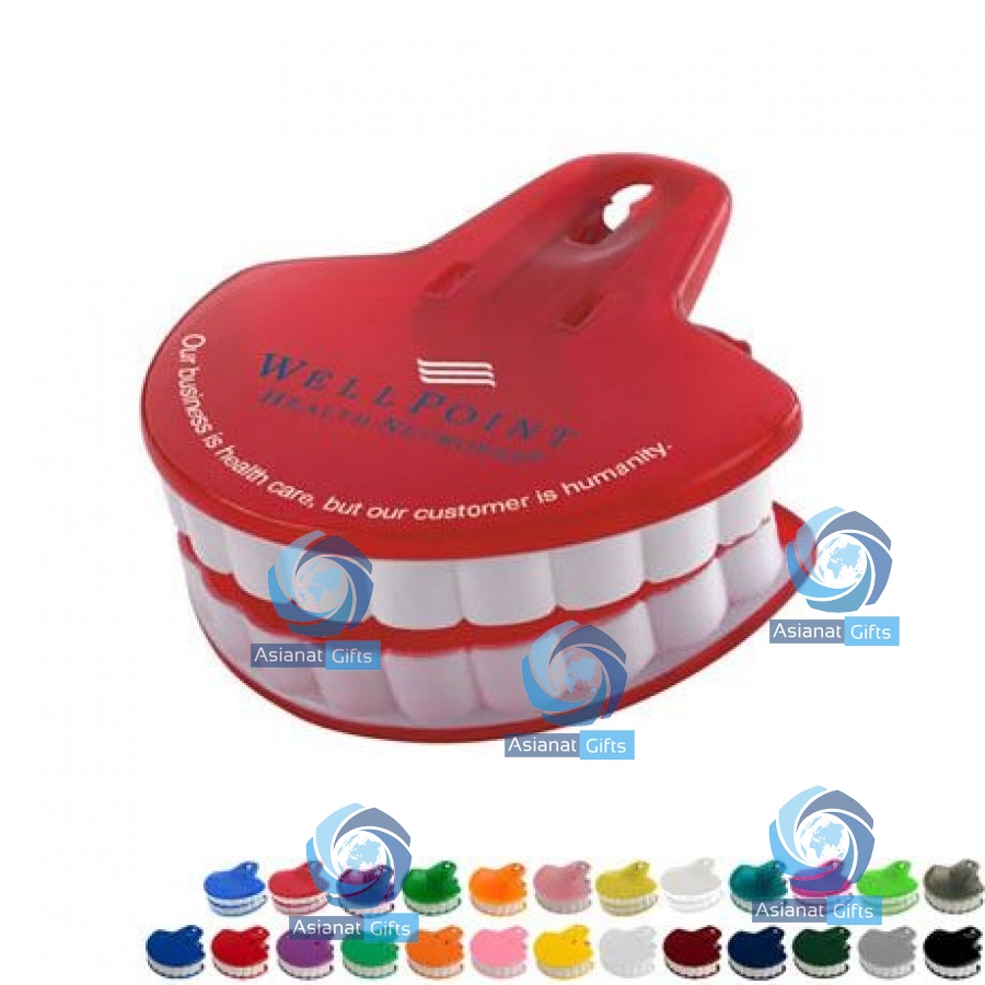 Provides a smile and a reminder, as it tightly seals food bags or neatly organizes papers or coupons. Ideal for dentists' offices, fundraisers, health clinics or anyone who wants to "take a bite" out of the competition. Add the optional magnetic backing and your clip serves as the classic kitchen refrigerator memo holder.