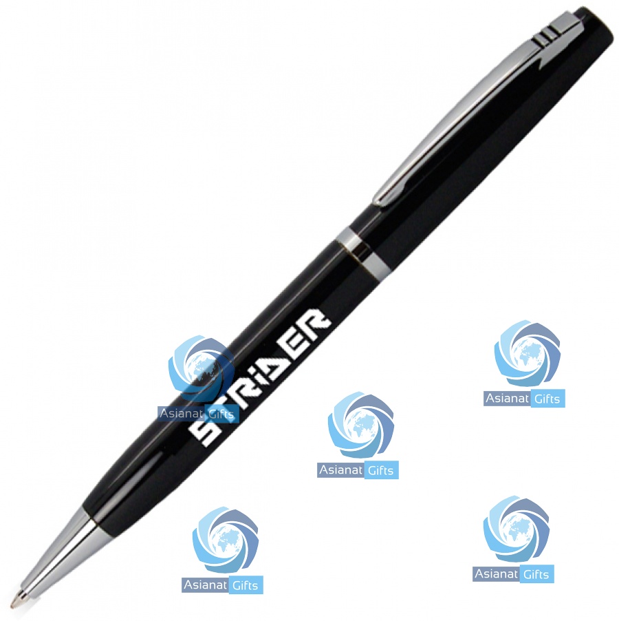 Modern twist action ballpen. Satin silver or gloss black finish with bright chrome trim. Black ink.