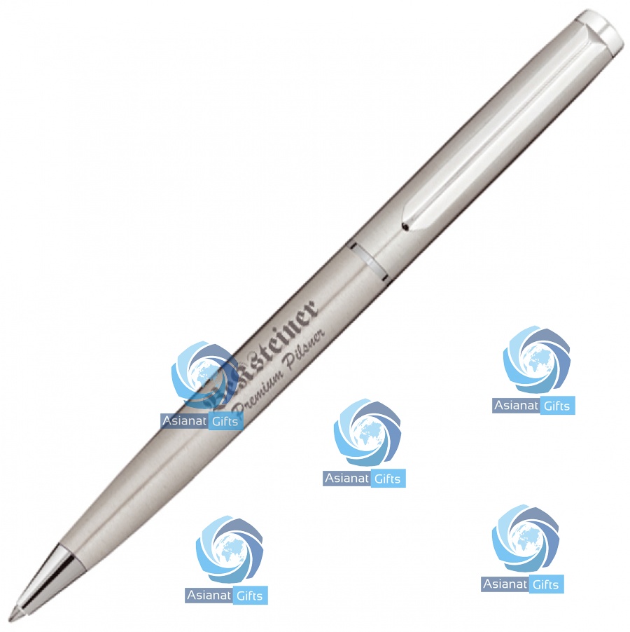 An elegant high quality ballpen in brushed stainless steel or gloss black or dark blue lacquer with a self return twist mechanism and a super smooth black ink refill. Various presentation boxes are available at additional cost.