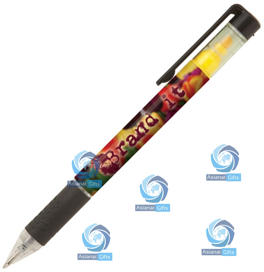 Twist action ballpoint pen with black ink and a long lasting yellow highlighter in one. Soft rubber comfort grip. A clear protective cap keeps the highlighter ink from drying out.