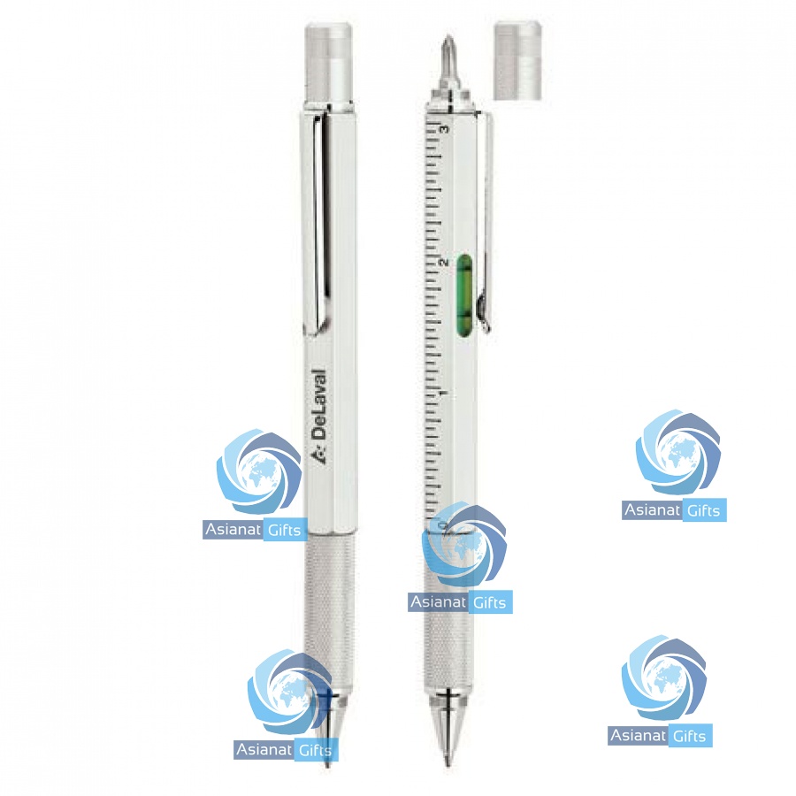 Features a twist action ballpoint, 3" ruler, spirit level, textured metal grip and a reversible small and flathead screwdriver.Black Ink.