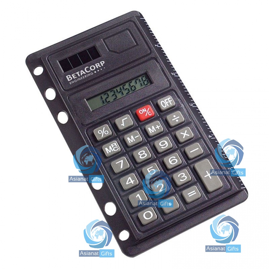 Calculator includes side holes to attach into a 3 ring binder. Features an LCD display, 5-1/2" side ruler, and raised plastic keys. One watch battery included.