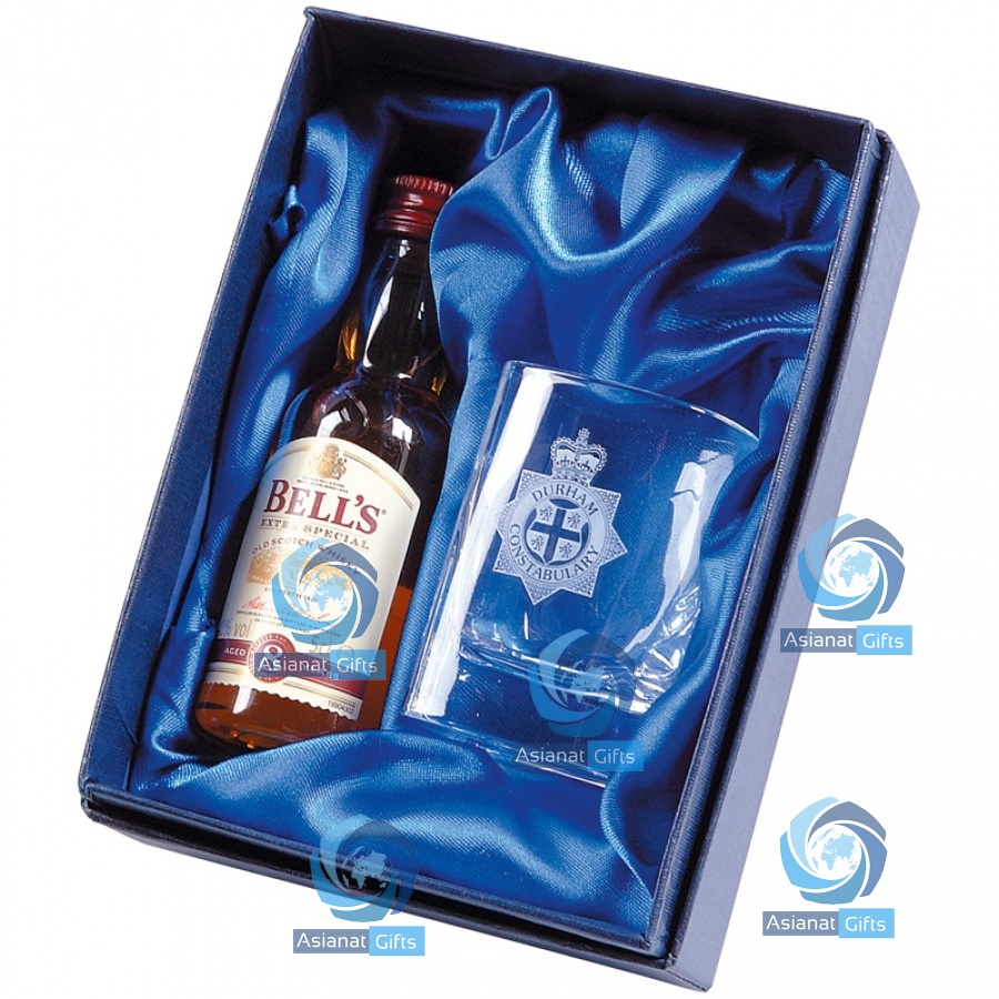 Square tot glass and a 5cl miniature of whisky, vodka, Baileys or rum. Supplied in a satin lined box. A quality gift for presentations and promotional campaigns, to get your brand noticed.