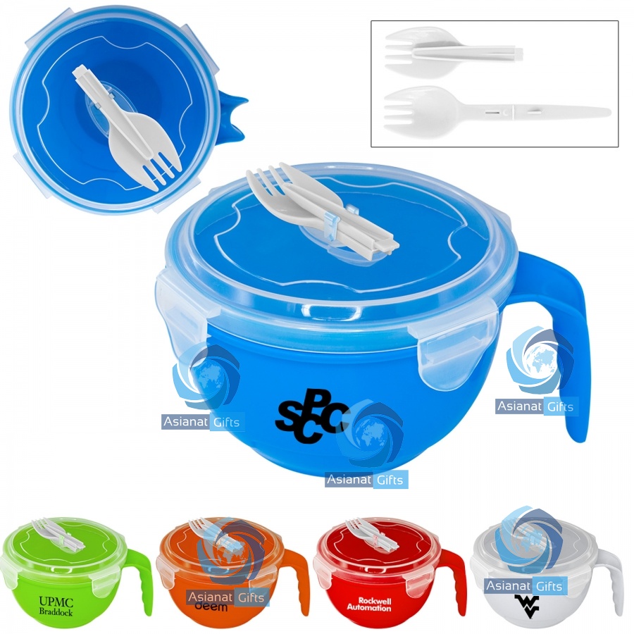 Noodle bowl with handle. Locking lid with silicone gasket, vent on lid to release heat, holds four cups. Folding spoon/fork combo attached to lid. Freezer and microwave safe. BPA free. 3.75" Diameter x 5.75" H
