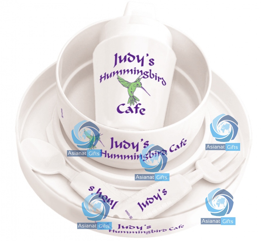 This set comes with all the pieces to serve a complete meal. Set includes our Plate, Bowl with Lid, 6 oz Juice Cup and our Fork & Spoon. Products are shrink wrapped together for a great gift. Choose from white or colored cups.