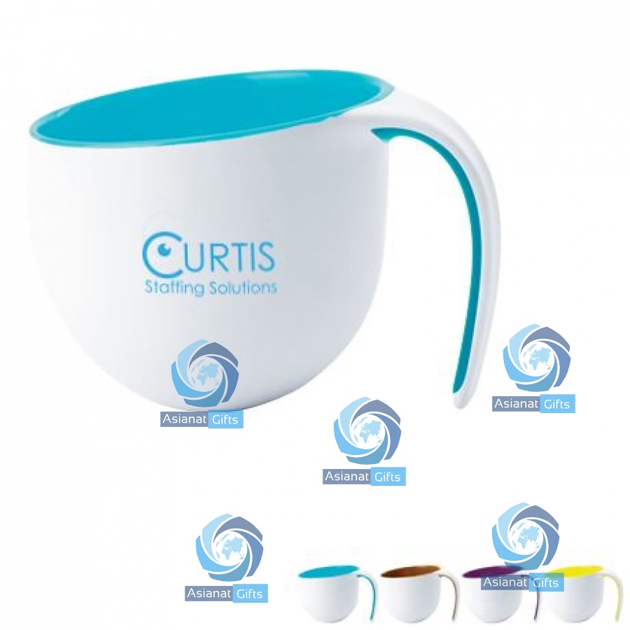High quality double wall porcelain mug features a matte white exterior with glossy color interior and handle accent. Unique free flow handle makes this a captivating design. Gift boxed.