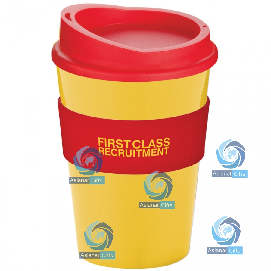 Offered in thirteen glossy colours or you can choose a full colour print moulded into the mug itself. Supplied with a silicone grip and a cliip-on lid with a matt finish. BPA free, top-rack dishwasher safe. 325ml capacity.