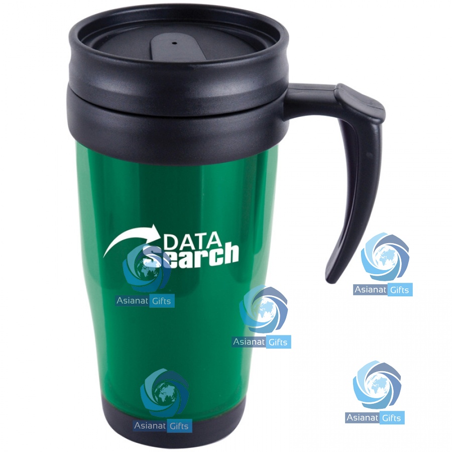 450ml plastic double walled translucent travel mug with handle, screw on lid and black sip cover. A promotional gift item that is always well received.