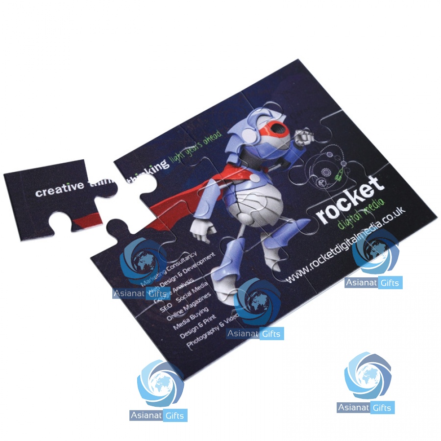 12 piece promotional jigsaw with full colour print of your design. Supplied in pieces in a poly bag.