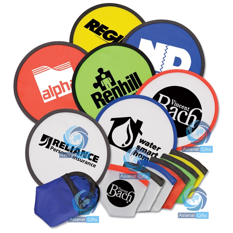 Lightweight fabric flyer that folds up and stores in a matching case. Imprint is available on flyer or case. Please specify. 9 1/2" Diameter