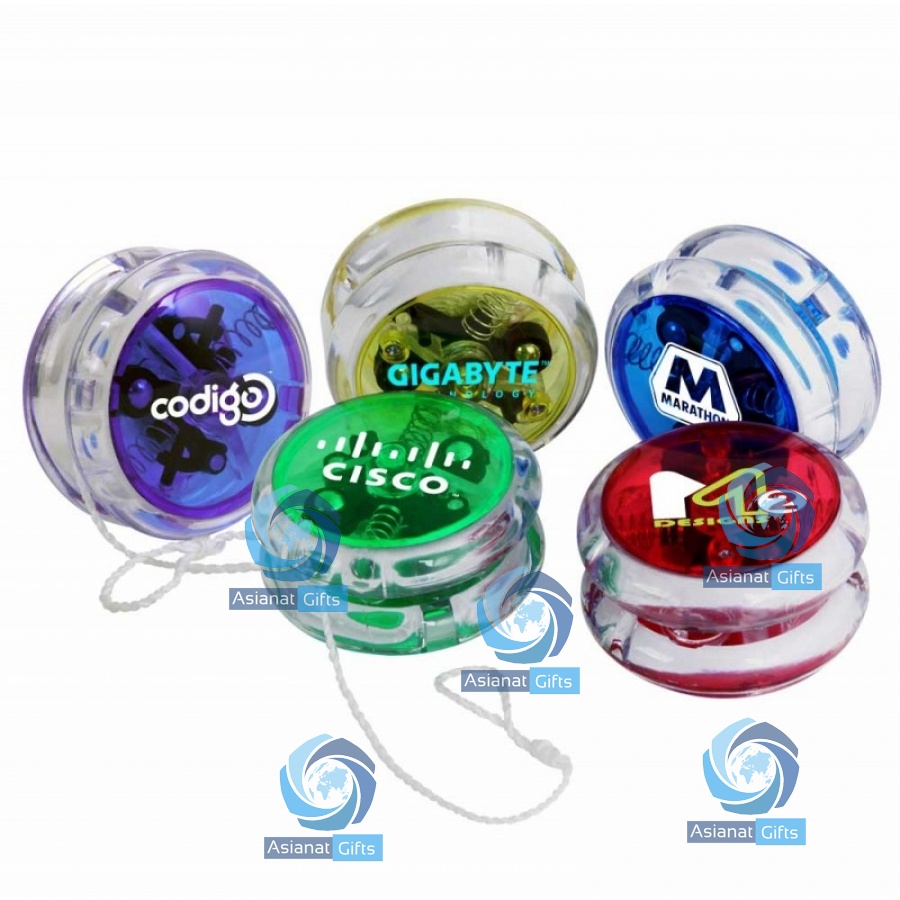 Light up colorful plastic yo-yo with a clutch and bearing so you can do all of your favorite tricks. The blinking red lights are activated and glow when the yo-yo is spinning. We do not recommend black imprints. 2 1/4" Diameter