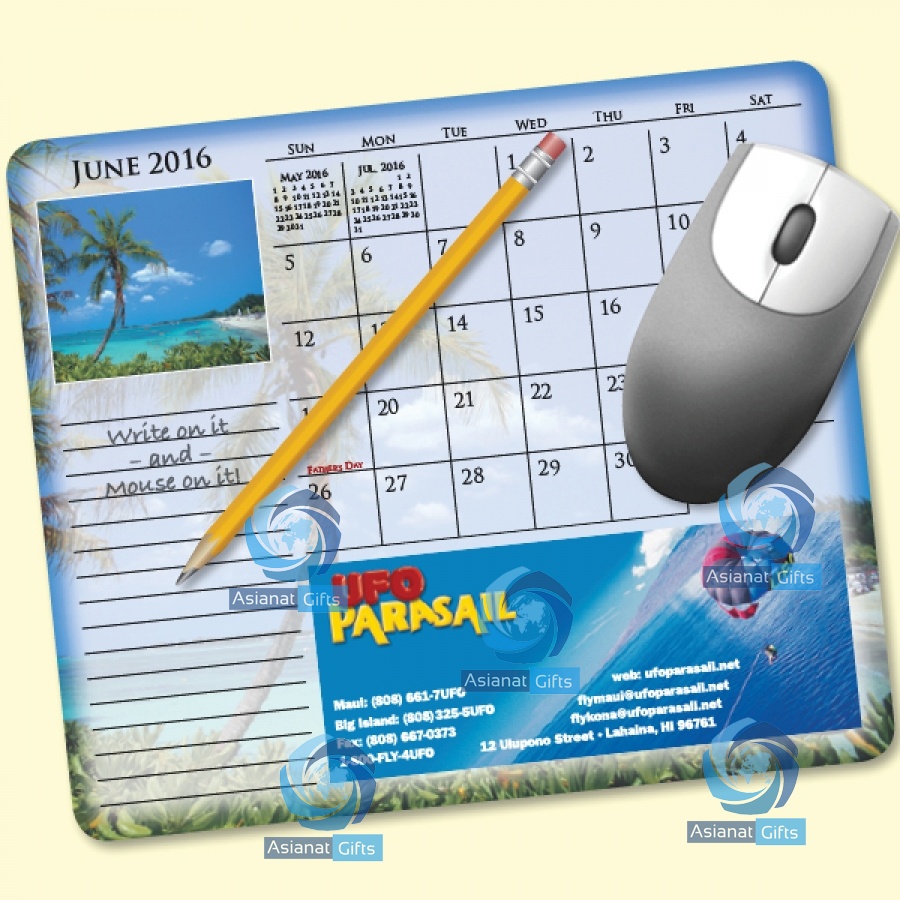 7.25"x8.5"x12 Month Calendar Recycled Note Paper (Landscape) Mouse Pads have your message printed on each month. Built with post-consumer recycled paper - pages have 30% and backer is 100%, these Eco-Friendly calendar mouse pads are a promotional "triple-threat" giving you the full impact of a monthly calendar, note pad, and mouse pad. You can start your calendar on ANY month to create an effective calendar promo any time of year. 7.25" L x 8.5" W x .015"" Thick