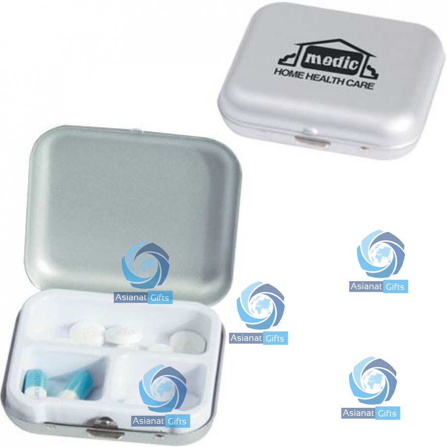 Brushed aluminum case snaps closed and has an easy-to-clean plastic interior tray with three separate pill compartments. Gift boxed.