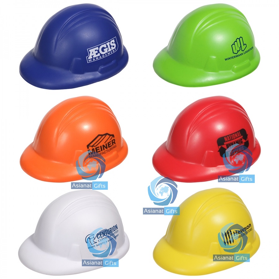 Hard Hat, Stress Reliever, Squeezable, Round, Flat Bottom, Polyurethane, Visor, Safety Helmet. 2 3/4" W x 1 3/4" H x 3 1/2" D