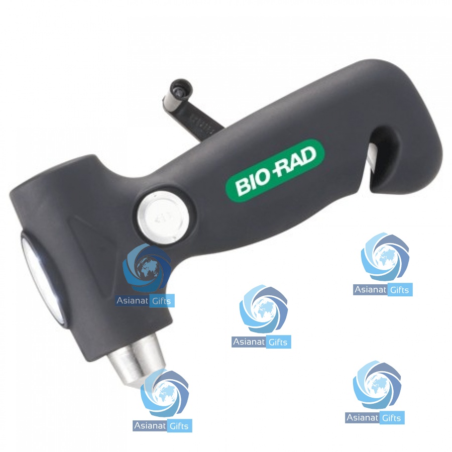 Let safety tool get you out of any jam! Three-in-one emergency safety tool includes hammer to break through glass, seatbelt cutter and dynamo flashlight. Crank handle to generate power. No external batteries needed. Rubber design handle for easy gripping. 6" H x 1" W x 3.25" L