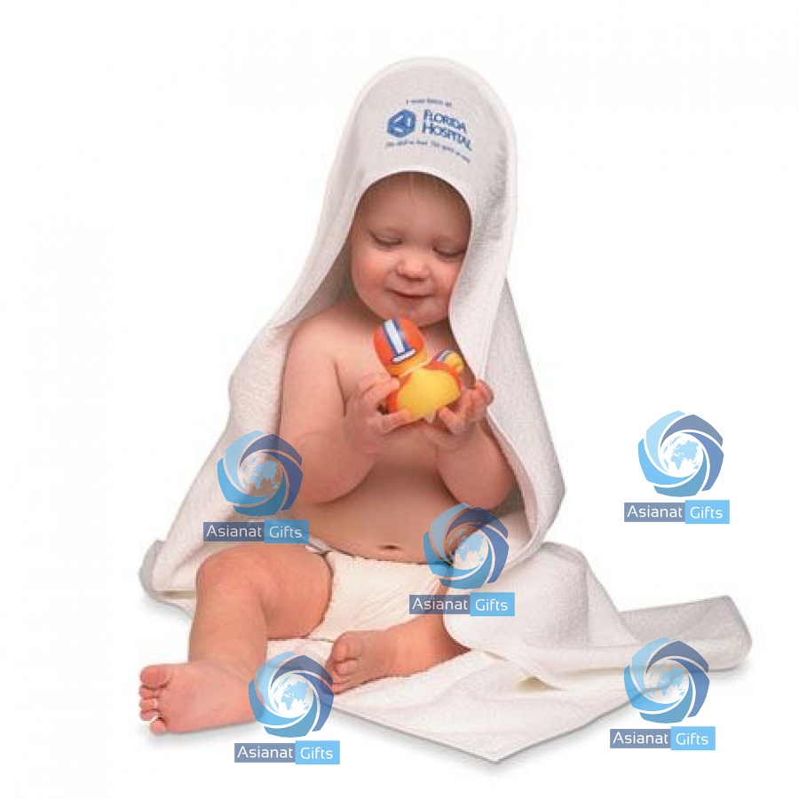 Keep your baby warm and dry with this white hooded towel. Made of super soft terry cloth, the hood on this towel can be customized with your message in full color. The perfect giveaway for hospital maternity, pediatrics offices, and more!