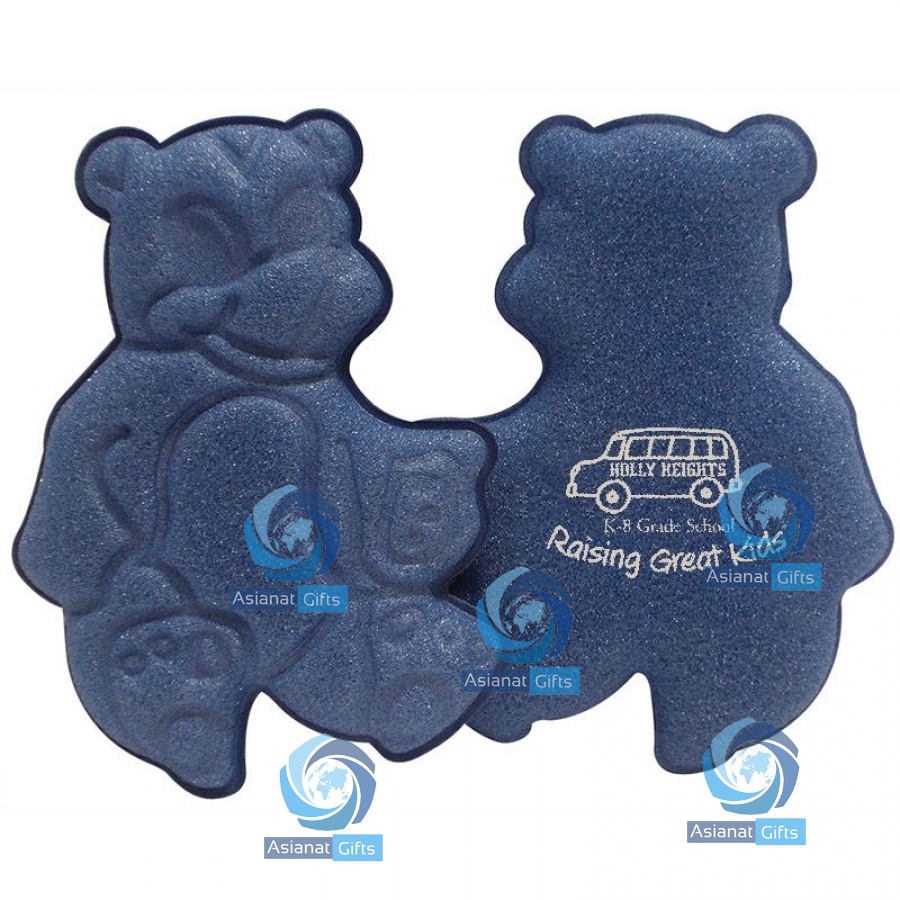 Thermally sealed bear shaped bath sponge is made of polyurethane open cell foam. Squeeze in bath gel and suds up! A great giveaway for hospitals, pediatricians, and child care programs.